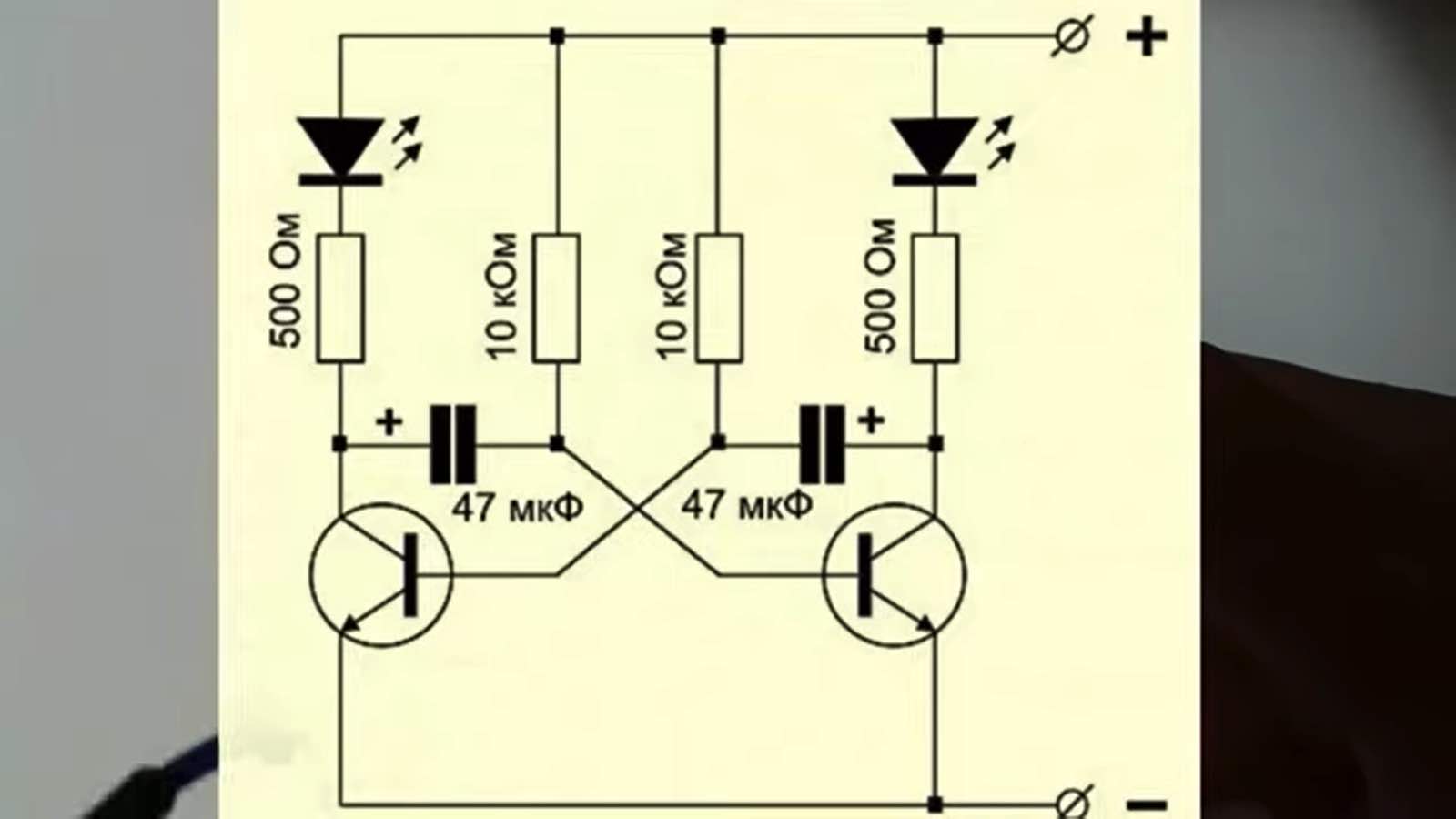 Стоит отметить, что схема парная (2 конденсатора, 2 резистора, (2 RC-цепи), 2 светодиода), а вот значения транзисторов могут отличаться (от 220 Ом до 300 Ом), в таком случае схема все равно будет работать.