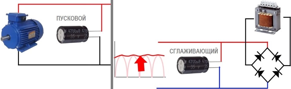 Начнем изучение с пусковых конденсаторов. Как известно у электродвигателей пусковой ток гораздо выше, чем номинальный рабочий ток. И так как конденсатор может отдать ток очень большой величины, то параллельно лини питания подключается элемент большей емкости. Если таким же образом установить конденсатор после трансформатора и диодного моста, то его уже можно будет называть сглаживающим. Дело в том, что скорость зарядки конденсатора велика, и он будет заряжаться пиками, полученными от выпрямленного переменного напряжения.