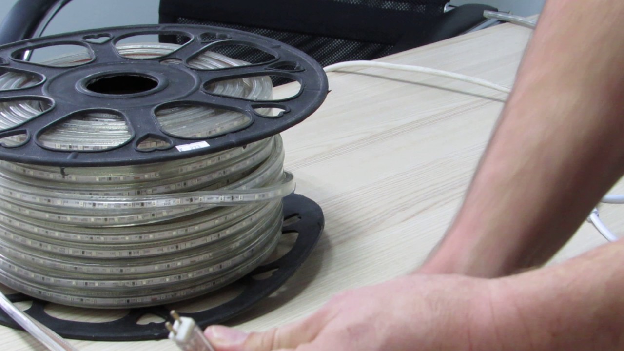 Снимать ленту с бобины нужно перед монтажом. Для монтажа может использоваться профиль, в который далее будет вставляться гибкий неон. Профиль может быть алюминиевый и пластиковый. Также он может быть длинный и короткий.