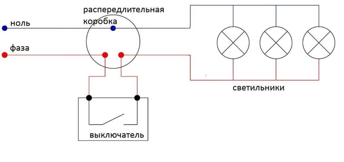 Очень важно, чтобы фаза шла именно на выключатель и дальше на светильники. Ноль должен идти на последний элемент электрической цепи