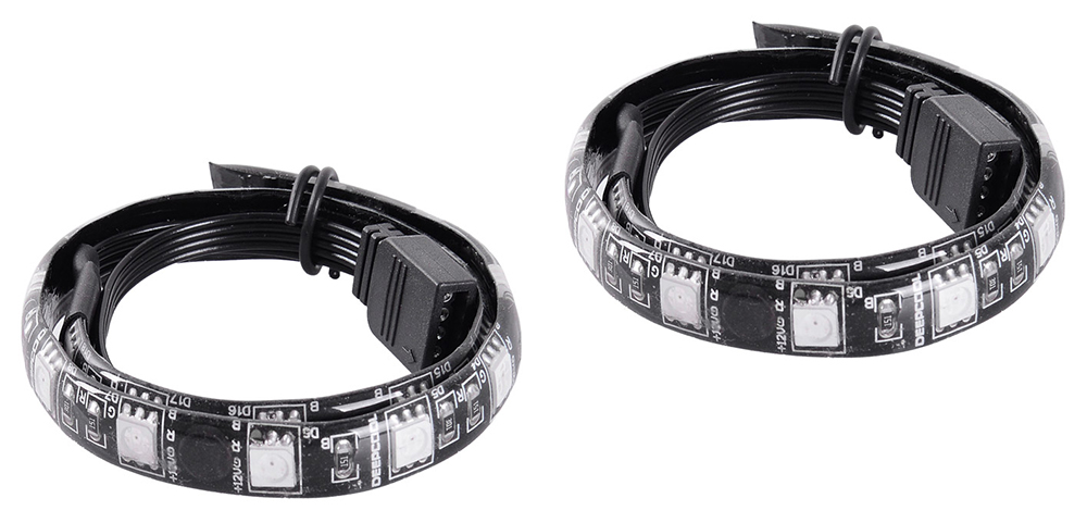 При цене в 1200 рублей является одним из самых доступных комплектов многоцветной подсветки. Он включает в себя две светодиодные ленты длиной 30 см и с 18 диодами на каждой. Данное решение больше подходит для применения в корпусах формата Midi-Tower, которые позволяют расположить одну ленту сверху и одну ленту снизу внутри корпуса. Крепятся ленты на магниты, что очень удобно, а штекер подключается в соответствующий разъем материнской платы.