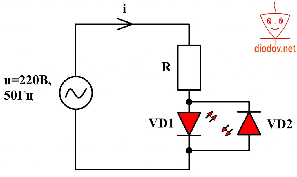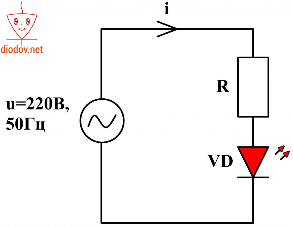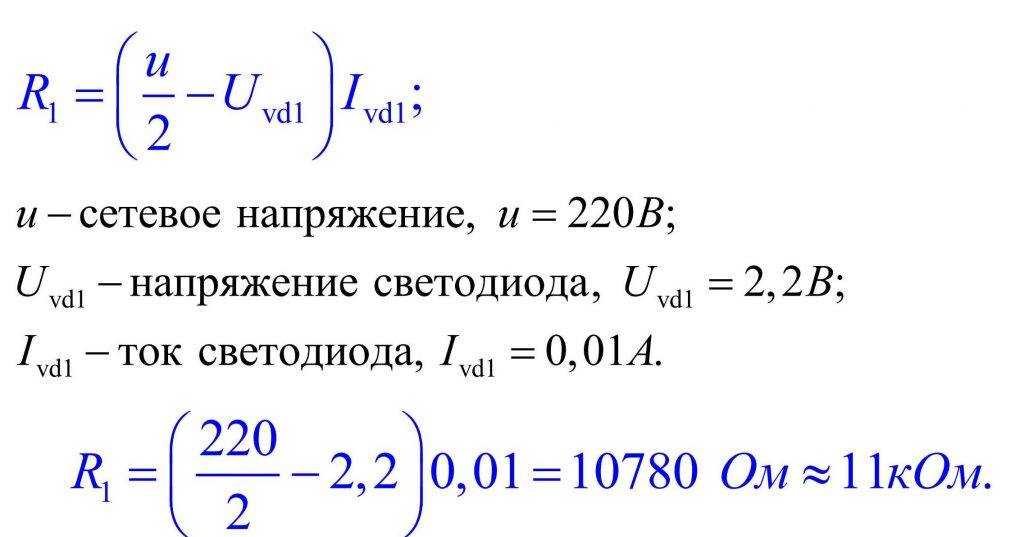В этом случае необходимо учесть, что через резистор ток протекает в оба полупериода времени, поэтому его сопротивление нужно снизить вдвое. Далее в последующих расчетах мы будем пользоваться схемой без шунтирующего диода.