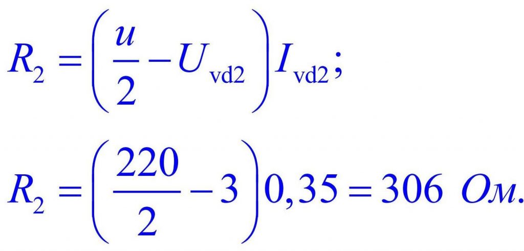 Теперь определим сопротивление резистора, соединенного последовательно со вторым светодиодом: