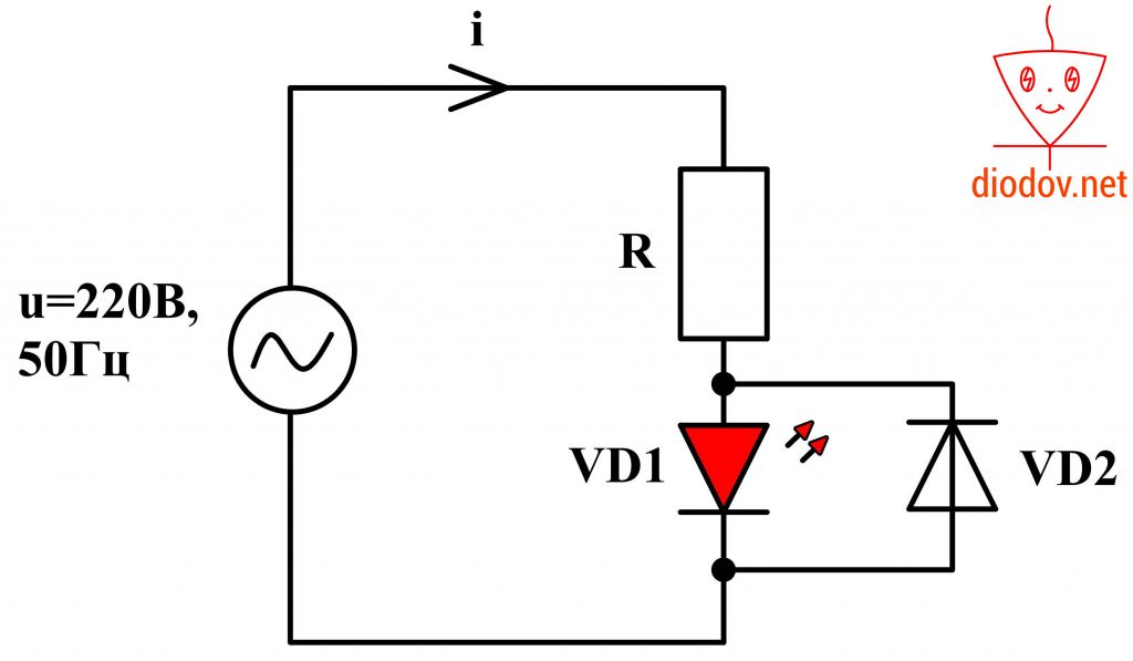 Не смотря на распространенное заблуждение, в отрицательные полупериоды сетевого напряжения, светодиод все-таки будет находиться в состоянии электрического пробоя. Но благодаря тому, что сопротивление обратносмещенного p-n-перехода защитного диода очень велико, ток пробоя будет недостаточен для вывода светодиода из строя.