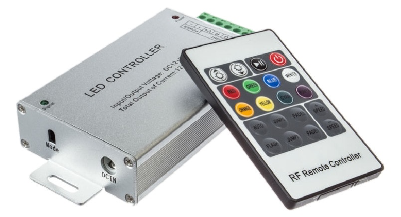 Управление светом осуществляется через специальный контроллер. Он подключается между блоком питания и светодиодами, снабжается проводным или беспроводным пультом.
