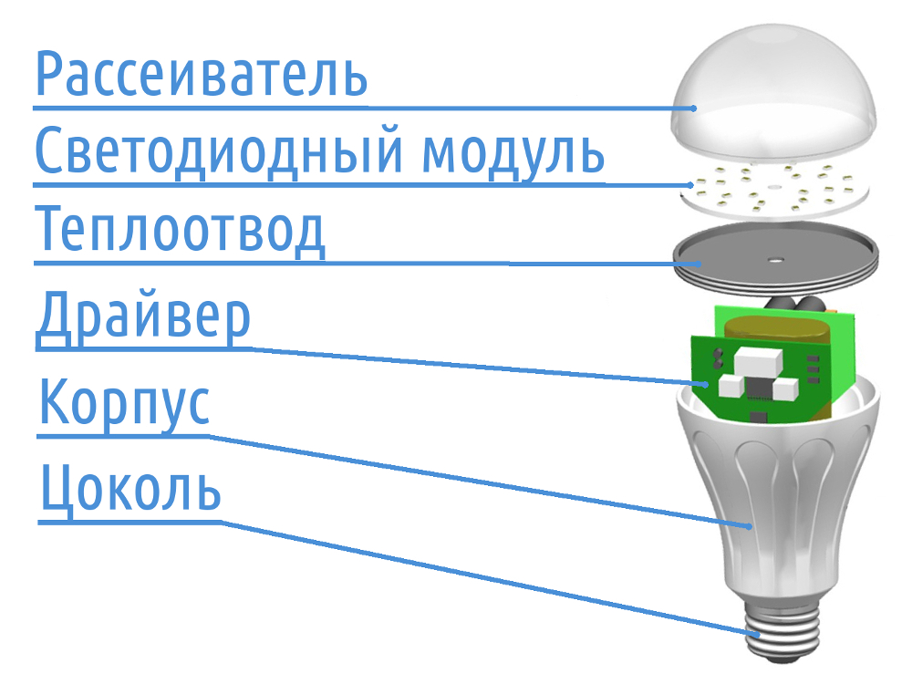 Светодиодная лампа (LED) считается самым экологически чистым источником освещения. Это наиболее продвинутое устройство, которое состоит из светодиодного блока, радиатора, светорассеивающего колпака, драйвер-блока и цоколя.