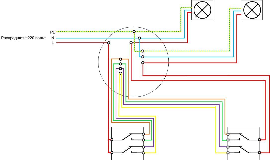 Схема подключения проходных включателей к двум лампам через распредкоробку.