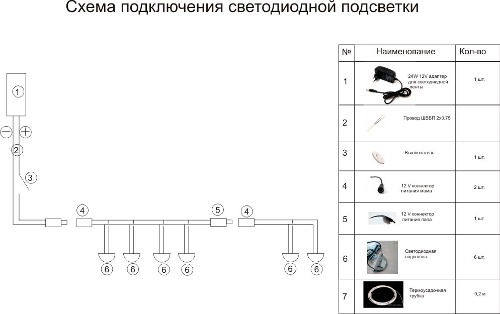- Соединяем все элементы в схему, обязательно проверяем тестером проводку на короткое замыкание между питающими проводами и только после этого подключаем к сети. Подсветка готова.