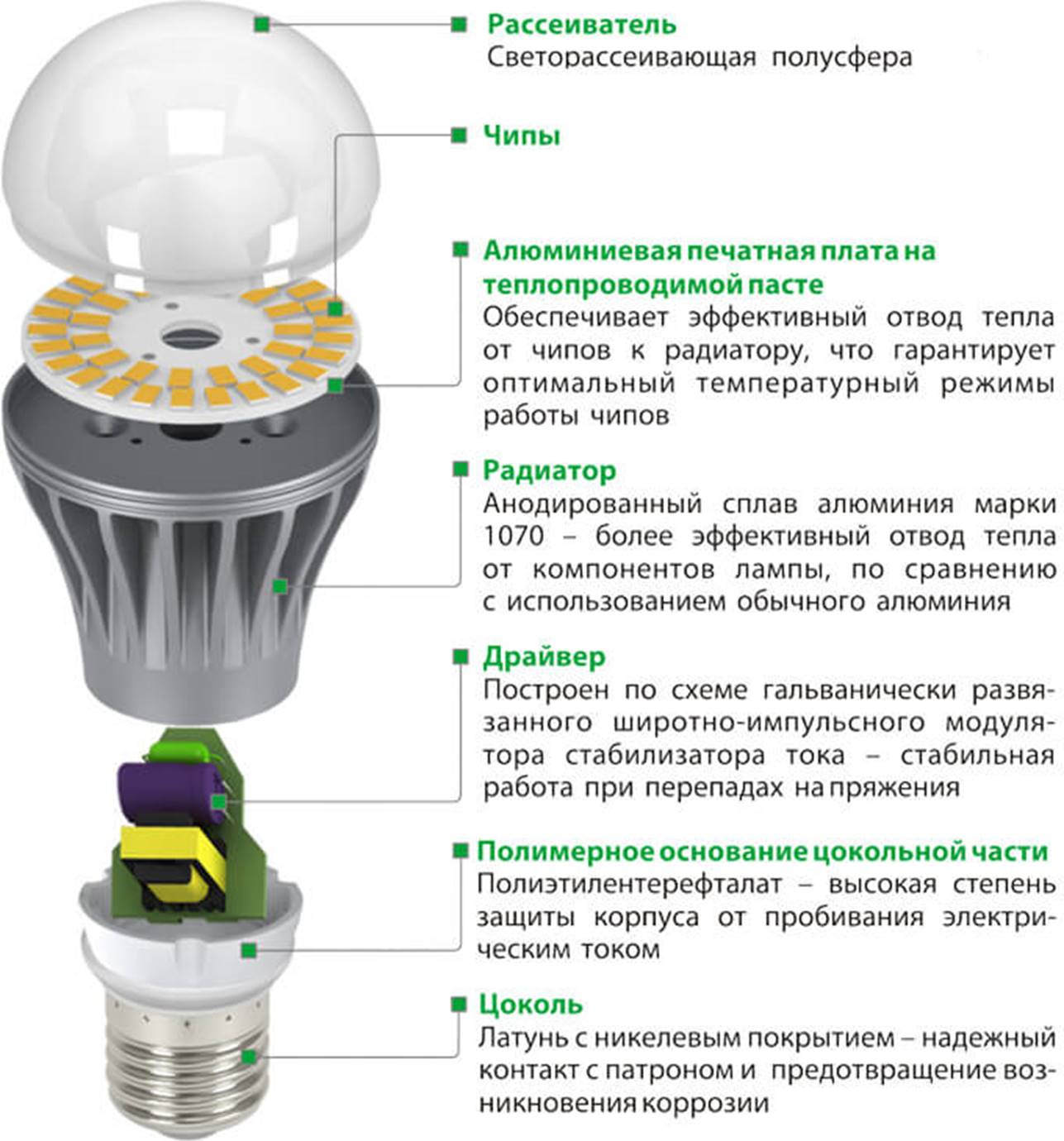 Вместо стеклянной колбы – матовый рассеиватель, нить накала заменили «долгоиграющие» диоды на плате, лишнее тепло отводит радиатор, а стабильность напряжения обеспечивает драйвер
