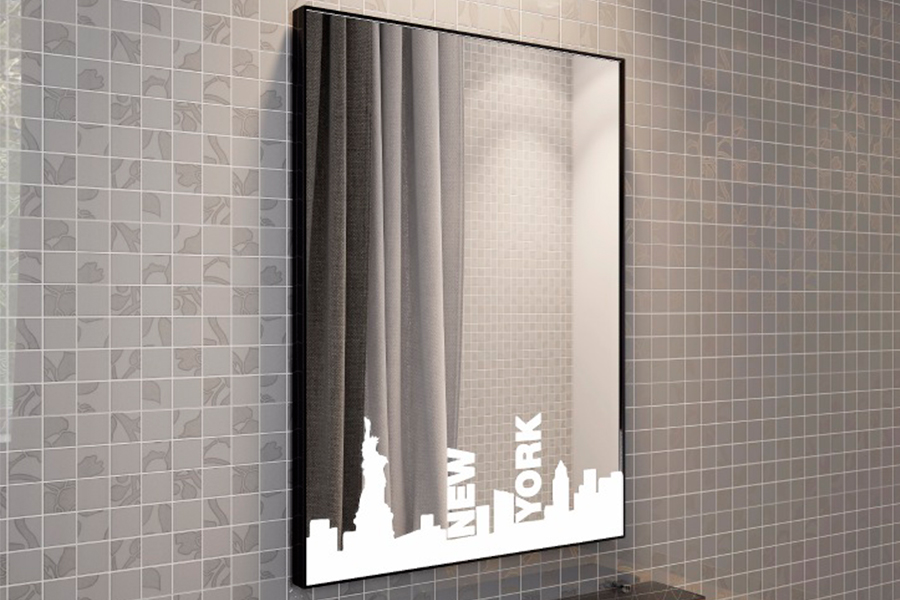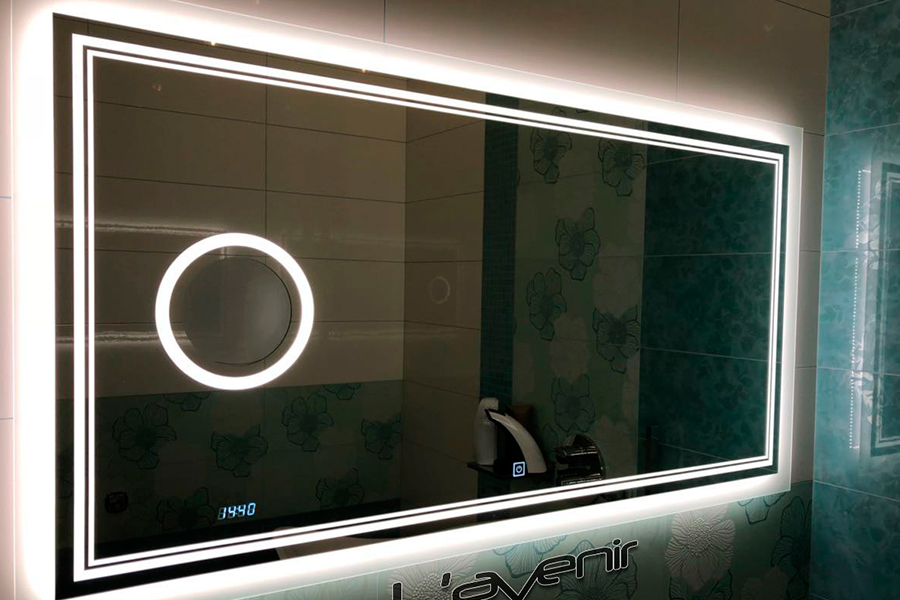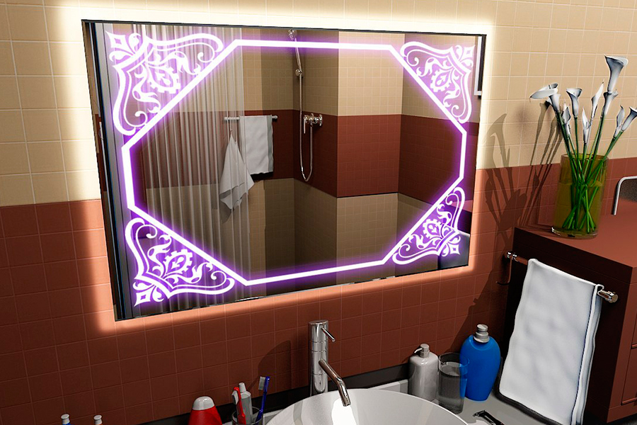 Для большей декоративности зеркала часто дополняются оригинальным рисунком или логотипом, который тоже светится. Вариантов масса от надписи до сложных композиций.