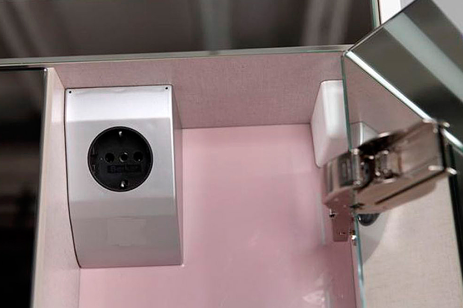 Может быть встроена в боковую часть или в козырек и соседствует с точечными спотами. Если зеркало объединено со шкафчиком, розеток может быть несколько. Такое решение сделает более удобным пользование электроприборами и позволит избежать необходимости монтирования розетки в стене.