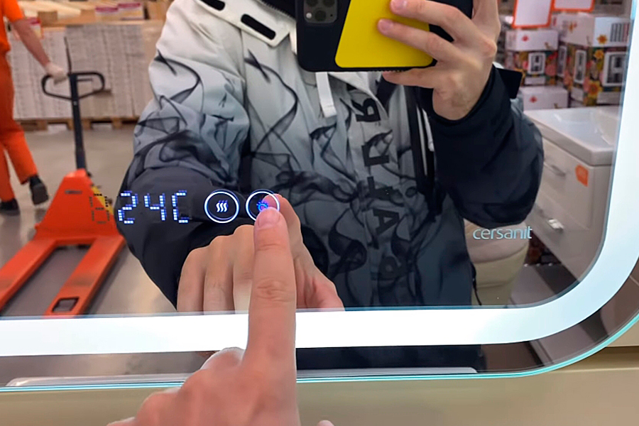 Более дорогие модели часто оснащаются сенсорным выключателем. Свет зажигается после прикосновения к какой-либо области на поверхности самого зеркала. Существуют модели с бесконтактным инфракрасным сенсором, который реагирует на приближение руки к датчику. Нет необходимости касаться датчика, он срабатывает на расстоянии до 5 см.