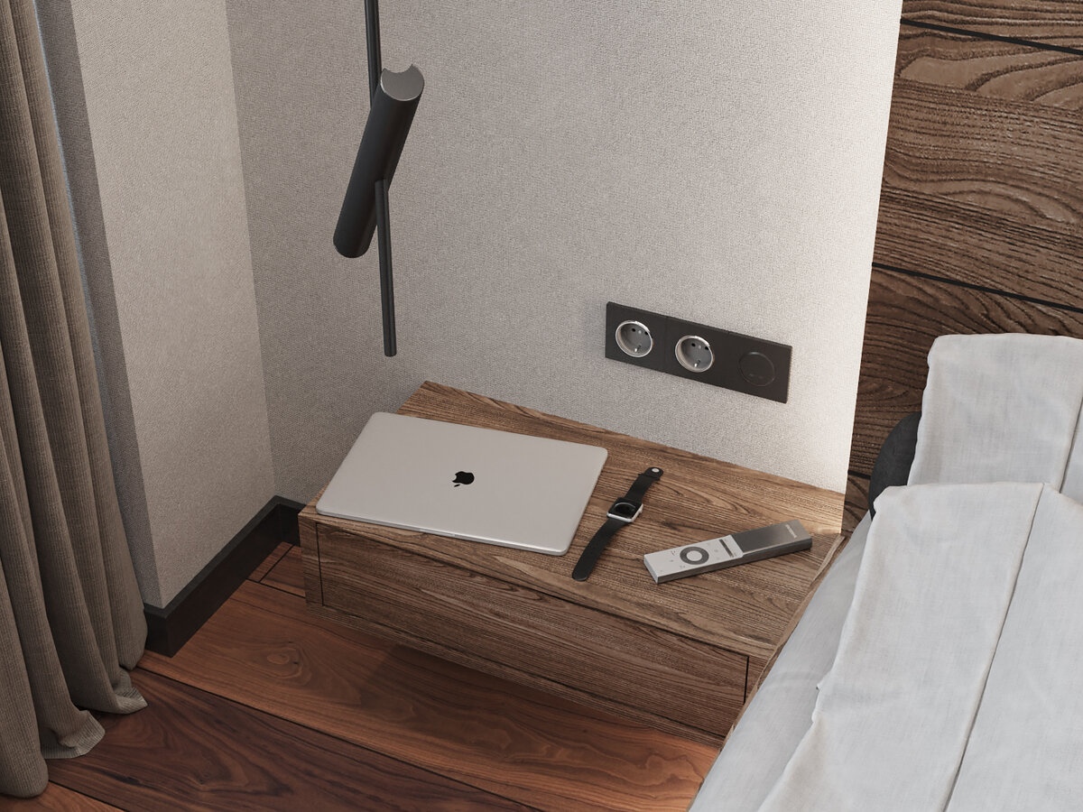 Кроме выключателя рядом с кроватью рекомендуем предусмотреть возможность для размещения одной или двух розеток с каждой стороны. Они вам понадобятся для зарядки телефона, плеера, ноутбука или планшета, которыми вы время от времени будете пользоваться, лежа в постели.