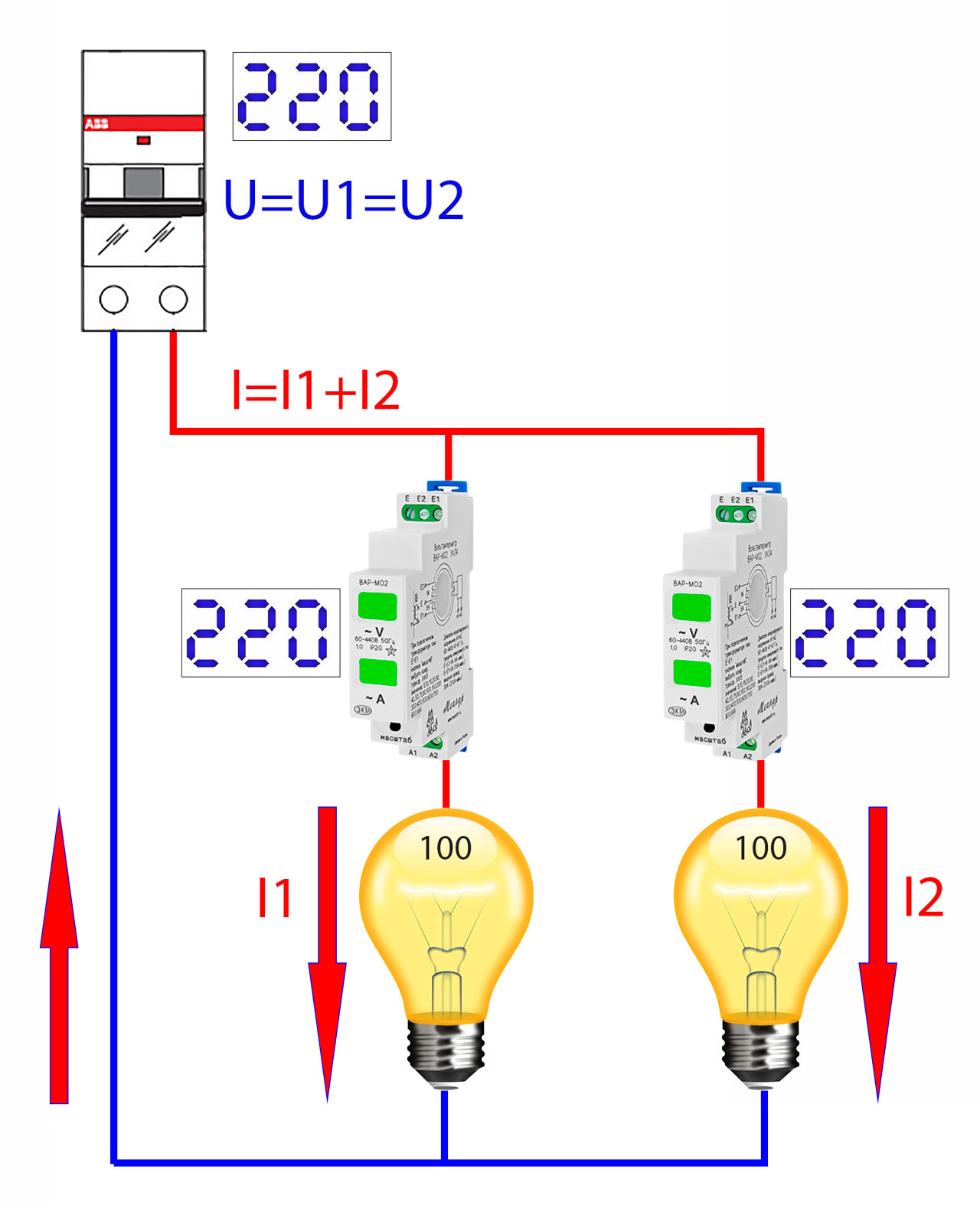 Однако если напряжение будет одинаковым, ток в цепи будет разным. Общее его значение складывается из суммы токов проходящих через лампочку №1 и №2.