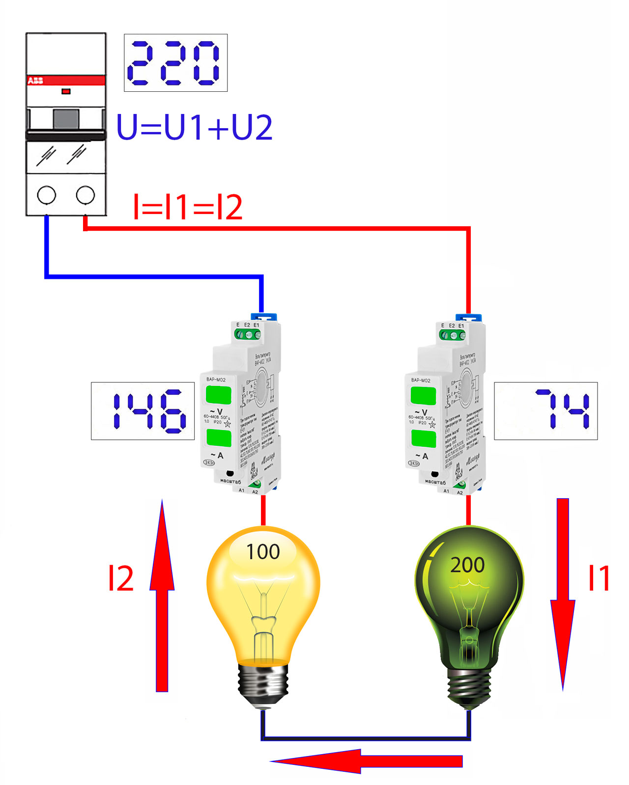Что же изменится, если вы включите последовательно две лампы по 100Вт? А случится то, что напряжение на них упадет примерно в два раза.