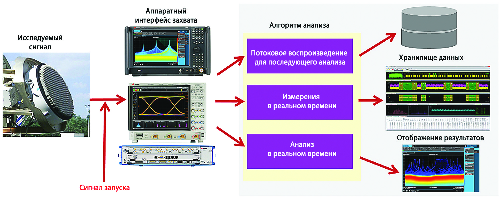 Рис. 4. Функциональные блоки процесса измерений параметров импульсов или сигнальной обстановки. Поскольку результатом захвата сигнала является набор цифровых выборок, сигнал можно записать в хранилище данных для последующей (или повторной) обработки