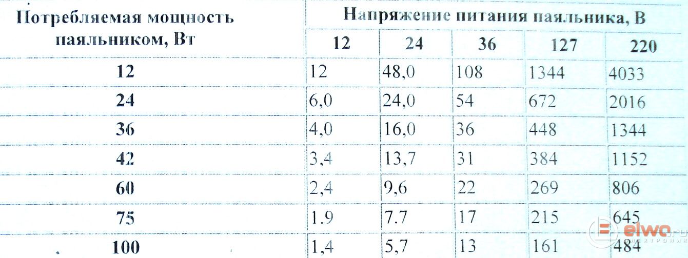 Таблица. Зависимость сопротивлении нагревательного элемента от мощности и напряжения паяльника