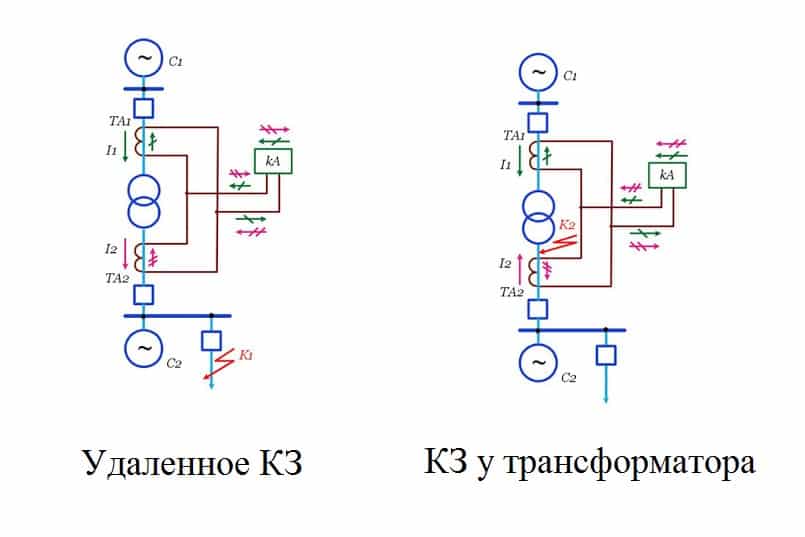 При возникновении короткого замыкания возникает асимметрия втекающих и вытекающих токов (Рис. 1 справа). Через реле протекает ток, включающий схему защитного отключения. Высокая избирательность дифференциальной системы не требует реле времени, т.к. защита включается в идеальном случае только при внутренних КЗ.