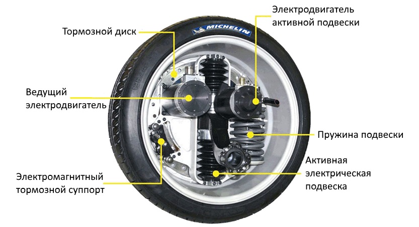 Нельзя не отметить еще один тип двигателя, который используется в некоторых современных моделях авто. Это система мотор-колесо. Пример — спорт-кар Volage. В такой конструкции предусмотрена возможность регенерации энергии торможения. Для этого используется тяговый двигатель Active Wheel. Он весит всего 7 кг, что позволяет добиться приемлемой массы колеса – 11 кг.