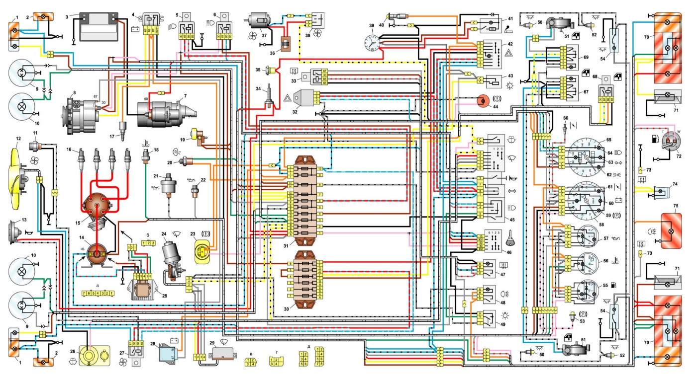 У таких автомобилей как ВАЗ-классика различных моделей (ВАЗ 2101- 07) схема электрооборудования самая простая, особенно у машин с карбюраторными двигателями. Особой сложностью не отличается и электрооборудование автомобилей ВАЗ-2108-09 (карбюратор).