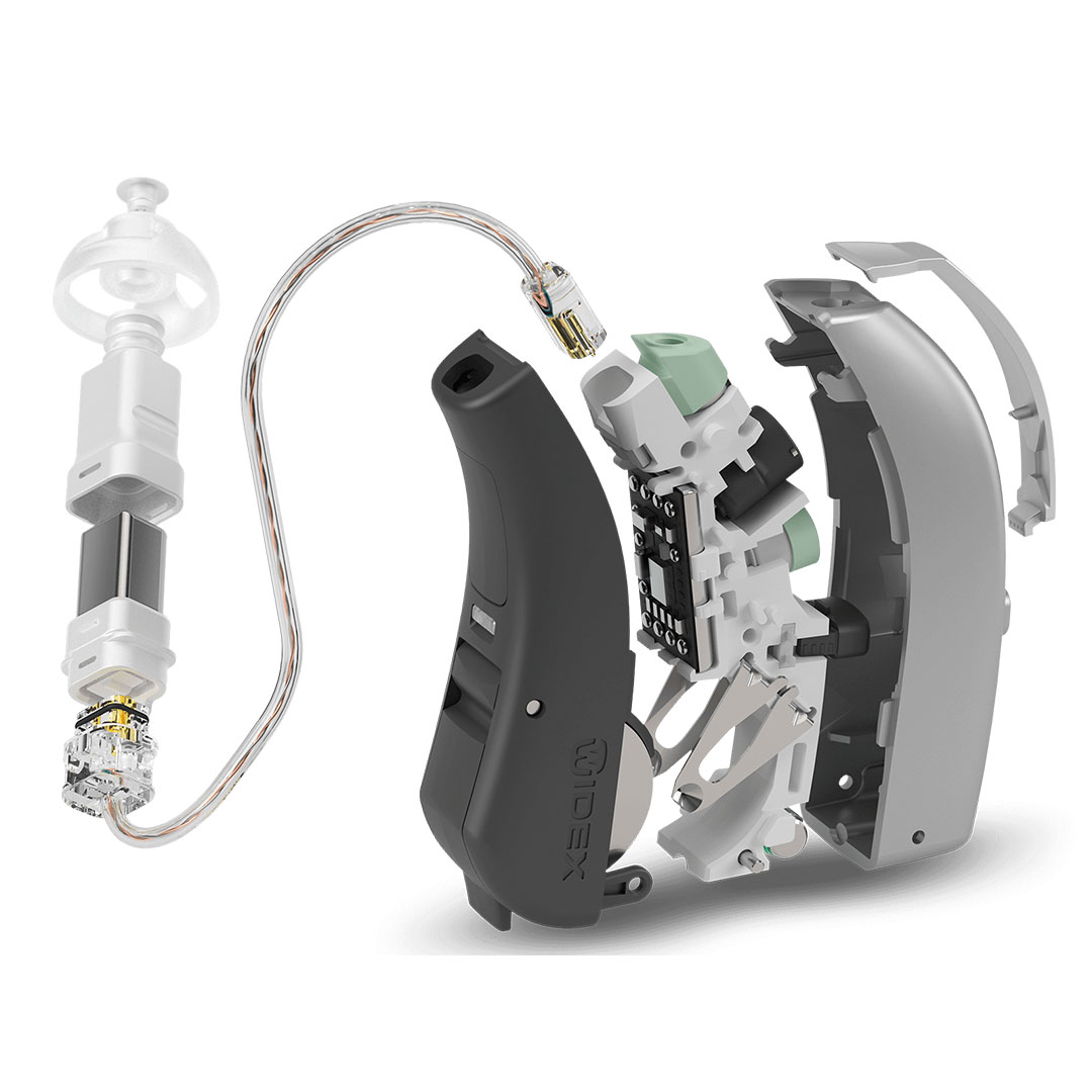 Микрофон улавливает звуки из окружающей среды. Затем сигналы оцифровываются. Информация приходит в микропроцессор. Компьютер просчитывает, какие из сигналов следует усилить. Так устройство «приспосабливается» к деловой беседе, футбольному матчу или просмотру сериала. У пациентов с поражениями улитки принцип действия слухового аппарата заключается еще и в избирательном повышении высоких или низких частот. Модифицированный сигнал подается на динамик. Длительную и бесперебойную работу обеспечивает батарея.