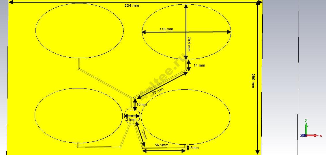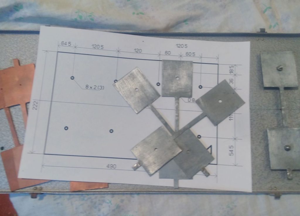 Экран сооружается в форме прямоугольника с габаритами 490×222×20, на его плоскости следует выполнить точную разметку положения панелей антенны. В местах их крепления сверлятся отверстия