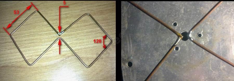 - Создание биквадратного типа антенного устройства в виде зигзага из меди. Все элементы располагаются в углах. Для поляризации горизонтального типа восьмерка должна стоять стоймя. Если делать вертикальную поляризацию, то конструкция ложится на бок.