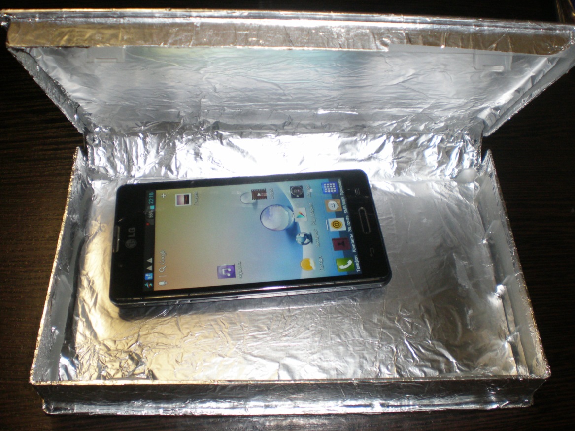 Для хранения различных гаджетов и небольших приборов можно использовать такой предмет, как обыкновенный фанерный ящик. Поступают следующим образом: Фанеру очищают от пыли и загрязнений; Разрезают рулон пищевой фольги на нужные отрезки; Оборачивают всю внешнюю поверхность ящика и его крышку фольгой матовой стороной внутрь; Места соединений изоляции скрепляют скотчем; На дно ящика укладывают один или несколько ковриков для компьютерной мышки; Проверяют плотность прилегания крышки к ящику по всему периметру, не допуская зазоров и разрывов фольгированной поверхности.