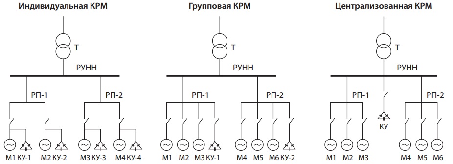 Выбор способа компенсации предполагает определение места установки конденсаторов (зачастую в составе конденсаторной установки (далее КУ)). Существует три основных варианта: