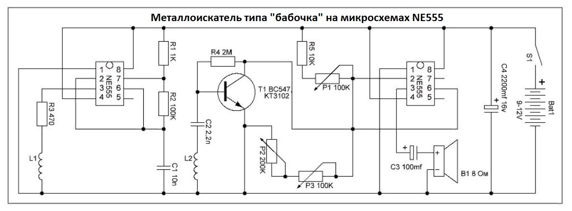 Схема с двумя генераторами одинаковой частоты. В режиме ожидания сигнал отсутствует. Если в поле катушки появляется металлический предмет, то меняется частота одного из генераторов и появляется звук в наушниках. Аппарат достаточно универсальный и обладает хорошей чувствительностью.
