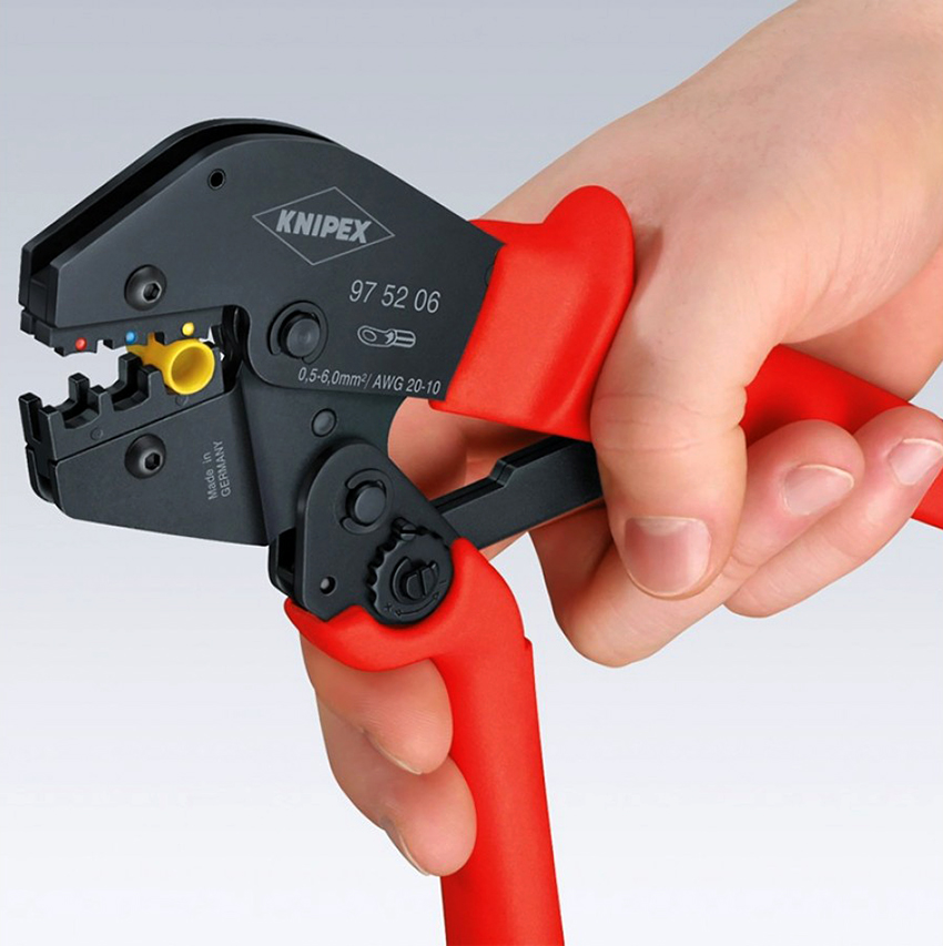 Характеристики кримпера для обжима изолированных наконечников, гильз и разъемов с красной, синей и желтой манжетами и сечением от 0,25 до 6 мм2