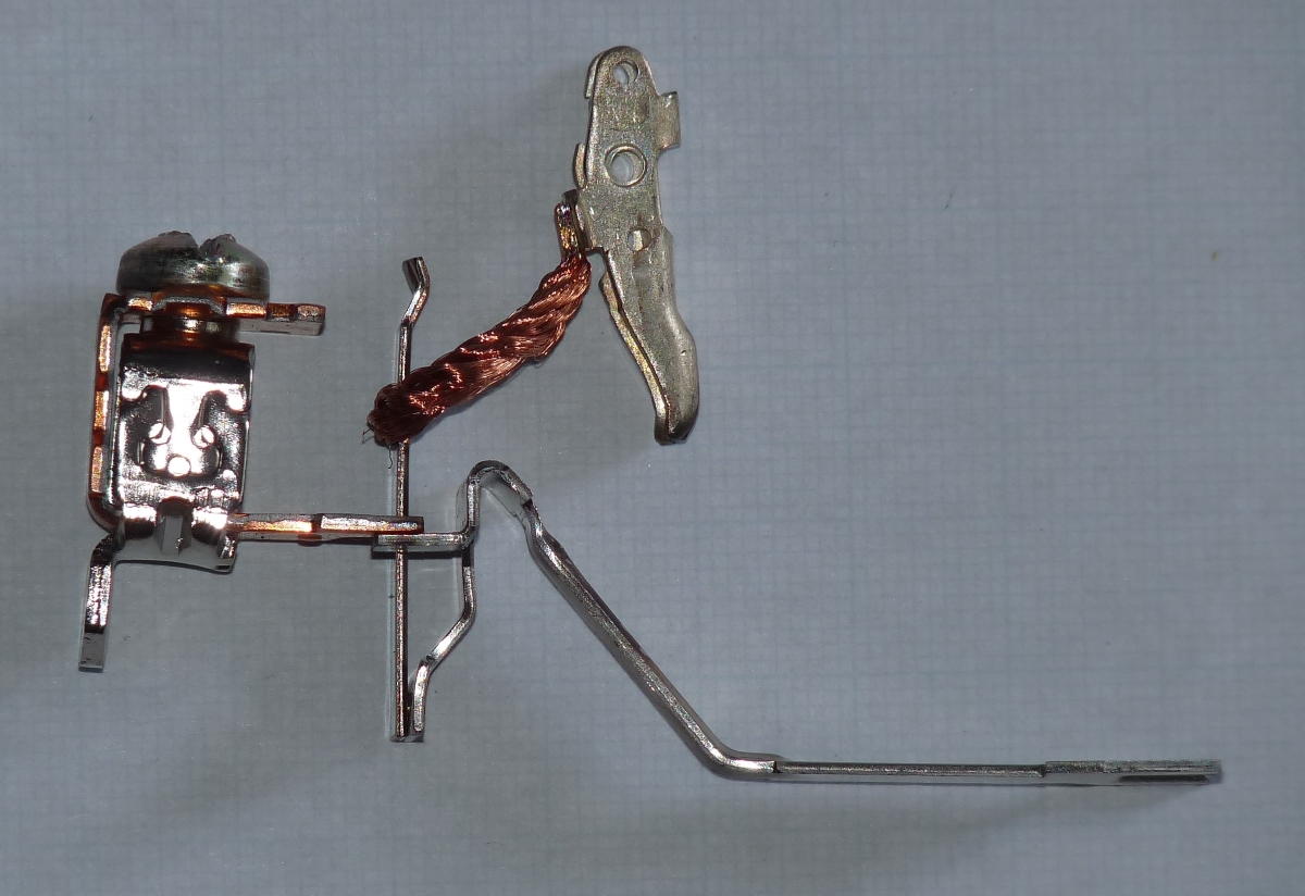 - Неподвижный контакт, подкинутый на верхнюю клемму, выступает в качестве упора для подвижного. Он же замыкает цепь при взводе механизма расцепления.
