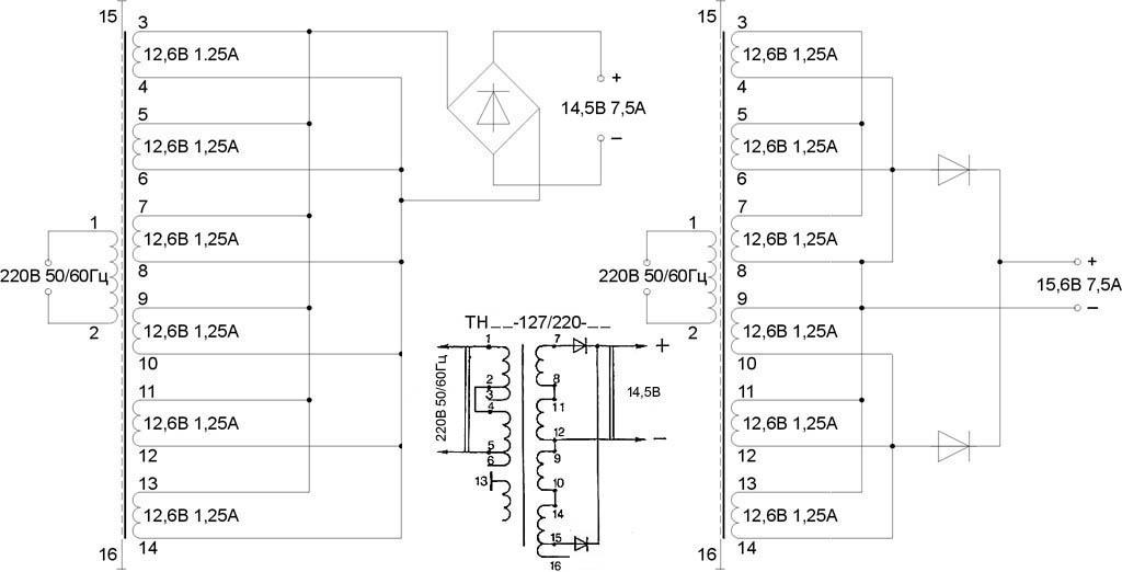 Вариант подешевле – присмотреть на железном базаре старый накальный трансформатор ТН; система обозначений аналогична ТП/ТПП. «Кладоискатели» до ТНов не охочи: возни с разборкой много, медяшки мало. Типовая схема включения ТН для ЗУ дана на врезке в центре рис. Переключать, для повышения выходного напряжения, нижний по схеме диод с вывода 15 на 16 нельзя, нарушится симметрия обмоток!