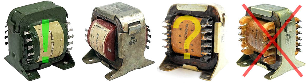 Если нет желания и/или возможности рассчитать и намотать трансформатор самому, для ИП ЗУ лучше будет купить трансформатор ТП или ТПП, они дешевле, чем ИБП б/у. Мощность – от 50 Вт, ее указывают последние 2 цифры в обозначении типономинала, напр. ТПП 36-220-80. 3 цифры в середине – рабочее напряжение первичной обмотки, а первые 2 или 3 кодируют количество и напряжение вторичных обмоток, оно 6,3 или 12,6 В на обмотку. Предпочтение следует отдавать трансформаторам в паровлагозащищенном исполнении («зеленым», слева на рис.), они способны неограниченно долгое время работать в атмосфере с влажностью 100% и примесями химически агрессивных паров. Трансформатор с обмотками на каркасе из плавкого пластика (справа) – вариант на самый крайний случай. Такие не рассчитаны на эксплуатацию в условиях ЗУ: работу свыше 50% времени использования на полной мощности с систематическими перегрузками по току. Вдруг берете такой, его мощность нужна от 120 Вт.