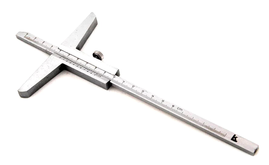 - Визуально он чем-то похож на штангенциркуль, но применяется он для установления размеров по горизонтальным плоскостям в вертикальной позиции;