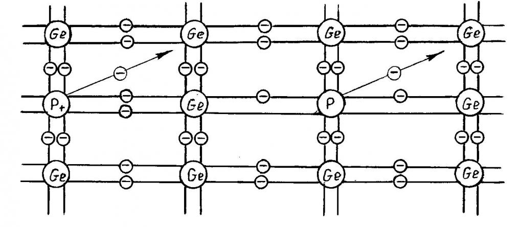 Для придания полупроводниковым приборам необходимых свойств в полупроводники добавляют примеси других элементов. В качестве таковых используются пяти- и трехвалентные элементы, расположенные в V и III группах таблицы Менделеева. При внесении в германий или кремний пятивалентных элементов (фосфора Р, мышьяка As, сурьмы Sb и др.) четыре валентных электрона примесных атомов образуют устойчивые ковалентные связи с атомами основного вещества. Пятые валентные электроны примесных атомов оказываются как бы лишними, они слабо связаны с атомами, и достаточно тепловой энергии, сообщаемой им при комнатной температуре, чтобы они смогли оторваться от атомов и стать свободными. При этом примесный атом превращается в положительный ион.
