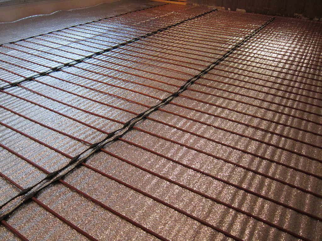 Маты, предварительно нарезанные нужной длины, расстилаются на слой теплоизоляции, от стен на расстоянии 15 см. Они не должны накладываться один на другой, следует делать небольшой отступ между ними.