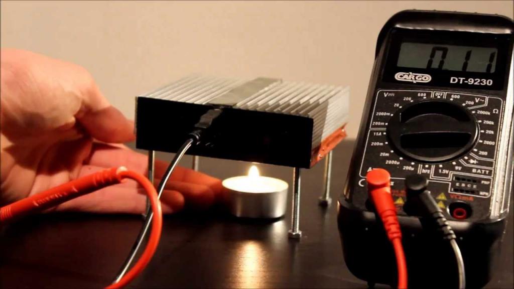 - Собрать конструкцию, и поднести источник тепла (свеча) к одному из радиаторов. Чем дольше нагрев, тем больше тока будет вырабатываться из домашнего термоэлектрического генератора.