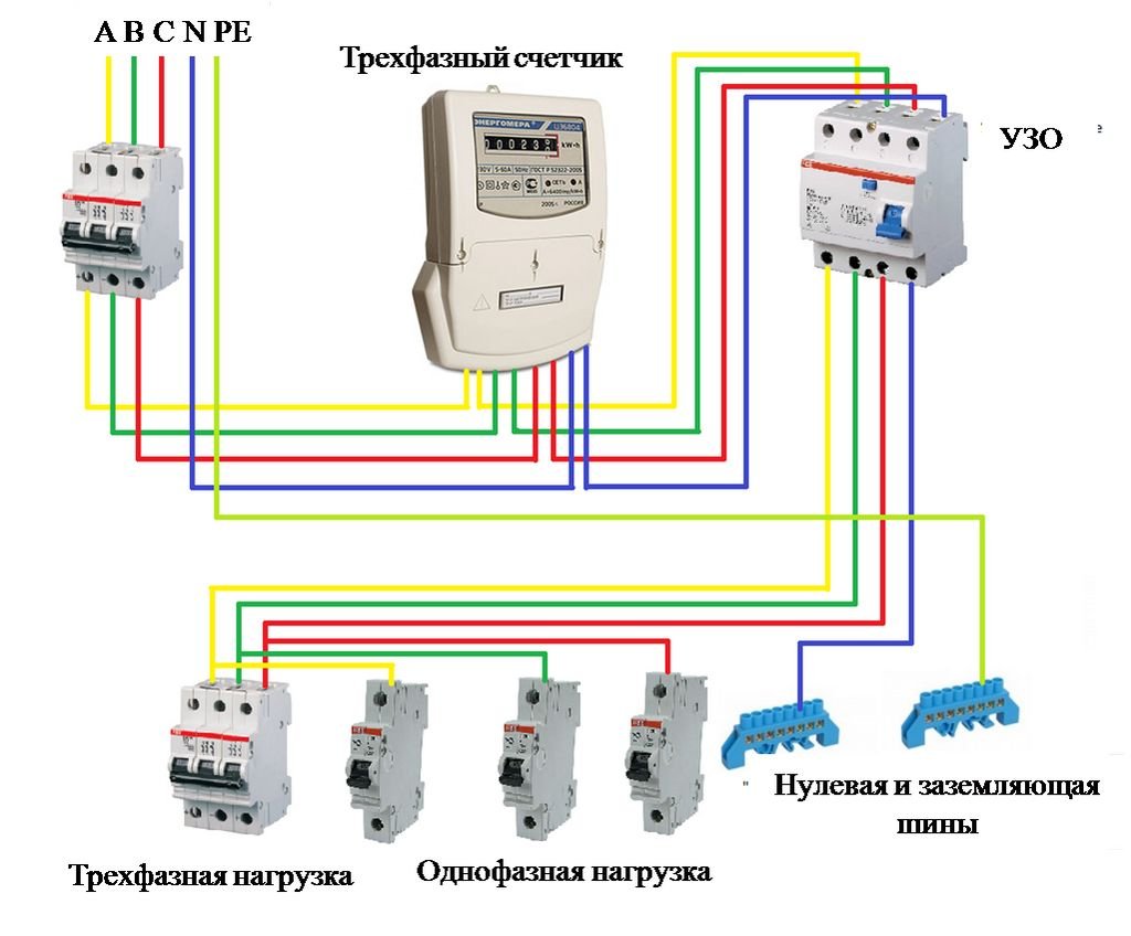 Если запланирована установка нескольких потребителей однофазного типа, то они должны равномерно распределяться, для чего подключаются через автоматы с разных фазных проводников, взятых сразу после электросчётчика.
