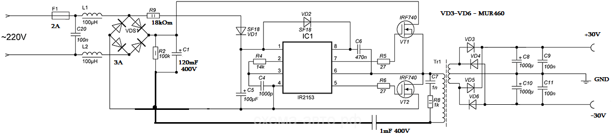 Сделать ЗУ для автоаккумуляторов можно в домашних условиях, рассмотрим процесс изготовления девайса со схемой IR2153. В этой схеме нет двух конденсаторных элементов, подключенных к средней точке, вместо них устанавливается электролит. По этой схеме можно изготовить девайс, который изначально рассчитан на невысокую мощность, но если вы хотите получить более мощное ЗУ, то можете немного изменить схему, добавив в нее мощные компоненты.