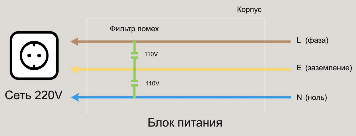 В таком случае корпус через один из конденсаторов фильтра будет соединен с нулевым проводом сети, а через другой — с фазой.
