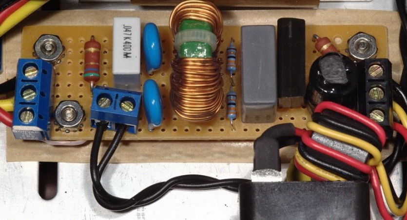 Его вход представляет собой пару конденсаторов, подсоединенных с одной стороны на каждый из проводов сети 220В.