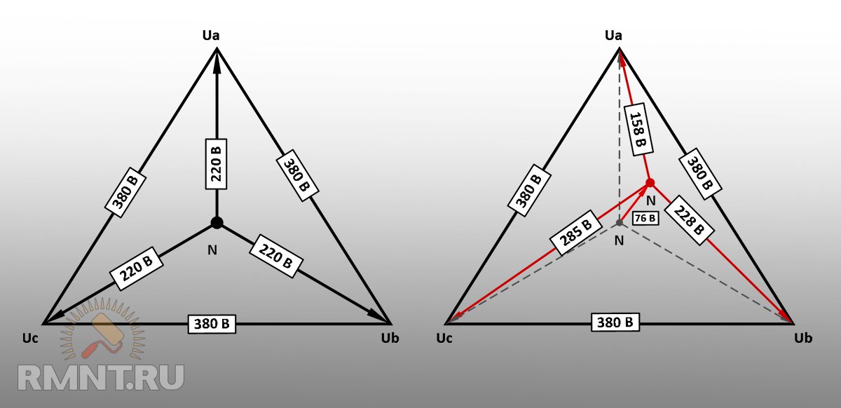 При появлении асимметрии нагрузок наблюдается потеря фазного напряжения на одной из фаз, при этом линейное напряжение остаётся постоянным. Схема, по которой соединены трёхфазные нагрузки, может быть рассмотрена как делитель напряжения: его падение на наиболее нагруженной фазе будет максимальным из-за низкого сопротивления, при этом на наименее нагруженных фазах напряжение будет расти и стремиться к линейному. Иными словами напряжение на фазах распределяется соразмерно подключённой нагрузке.