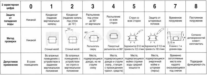 | 8 | Погружение на глубину свыше 1 м продолжительностью более получаса | Фактически это означает, что прибор рассчитан на эксплуатацию под водой. Пример — подсветка фонтана |