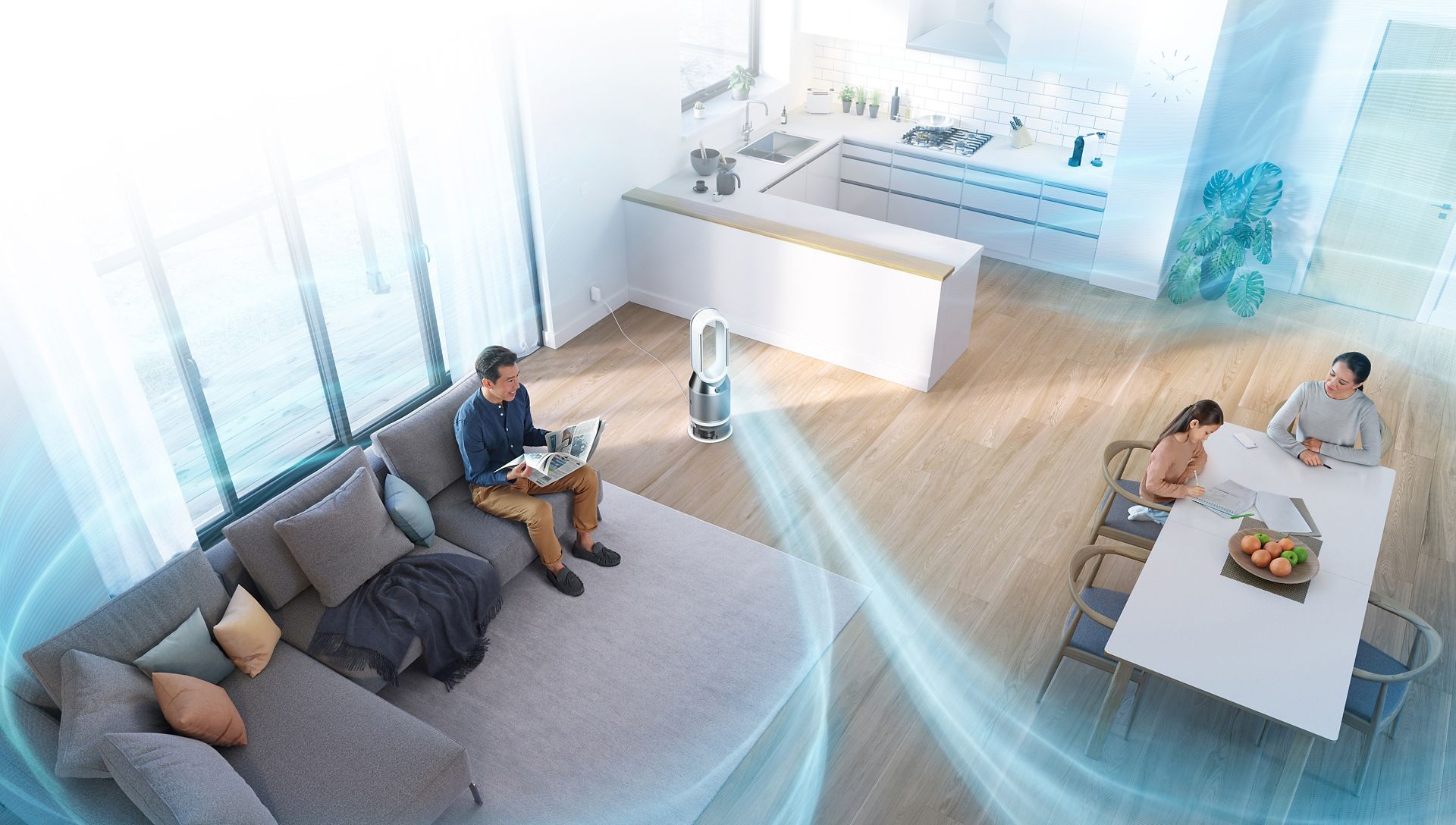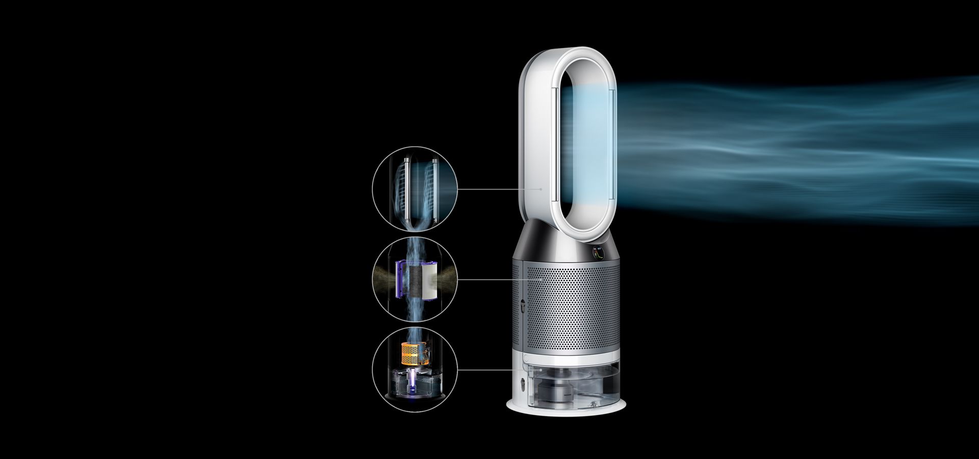 Увлажнитель-очиститель воздуха Dyson забирает воздух из комнаты. Увлажненный, очищенный поток выдувается через отверстия верхней части корпуса и идет в горизонтальном направлении. Владелец направляет и рассеивает движение воздуха, регулируя режим.