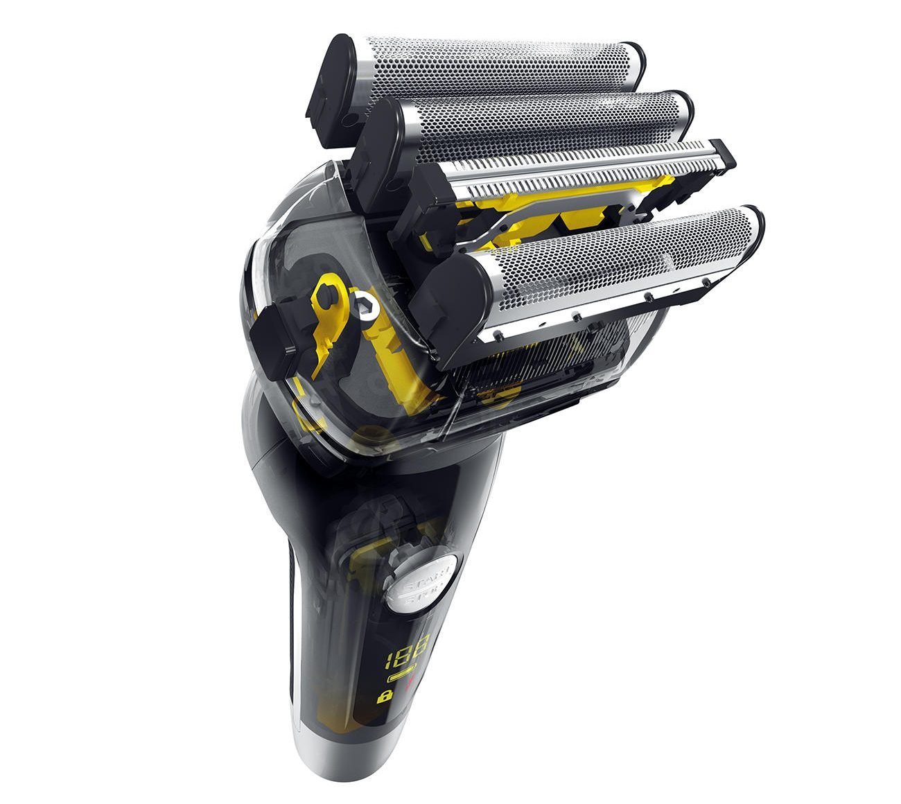 Электрическая бритва, оснащенная сверхподвижной головкой и 5 сетками и 2 силиконовыми роликами. Гибкая головка в точности повторяет изгибы лица, минимизируя дискомфорт и обеспечивая отличное качество бритья. Корпус водонепроницаемый, что позволяет промывать прибор под струей воды. Возможны разные варианты бритья: сухое или со специальной пеной (гелем). Автоматическая очистка позволяет удалить частички кожного жира и волоски, которые не удалось смыть водной струей.