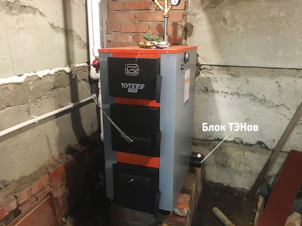 Основное отличие комбинированного оборудования от твердотопливного заключается наличии термоэлектрического нагревателя в емкости теплообменника. ТЭН включается автоматически в тот момент, когда мощности сгораемого топлива не хватает, чтобы обеспечить оптимальную температуру теплоносителя. Говоря иными словами, ТЭН запускается в работу, когда сгорают дрова или уголь, спадает жар и есть необходимость подогревать теплоноситель. Все процессы полностью автоматизированы и не требуют участия человека, за исключением, разве что, закладки дров в топку.