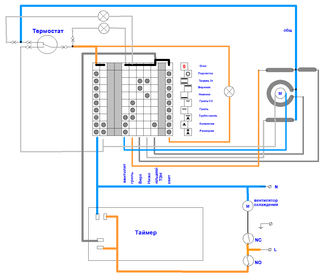 Конвекцию воздуха внутри камеры духового шкафа и равномерное распространение тепловых потоков обеспечивает крыльчатка. Большинство моделей дополнительно оснащены тангенциальным вентилятором (кожух с колесом с лопастями), одновременно предотвращающим утечку тепла и перегрев корпуса.