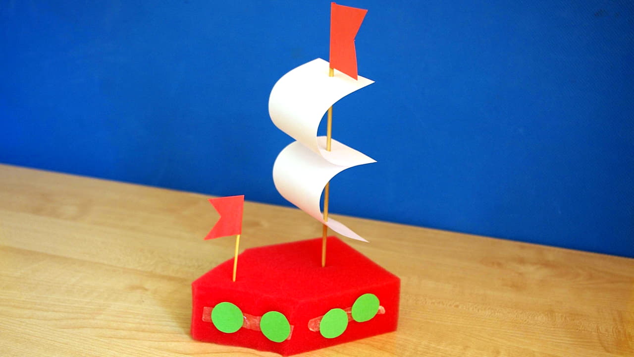 Самым простым вариантом поделки из губки считается лодочка с парусом. Такая работа по силам даже малышам. Губку можно оставить в первоначальном виде, добавив стержень из коктейльной трубочки и бумажный парус треугольной или квадратной формы. Дети более старшего возраста смогут придать поделке форму, более напоминающую настоящий кораблик.