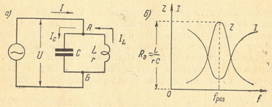 Схема (а) и резонансные кривые (б) для резонанса токов